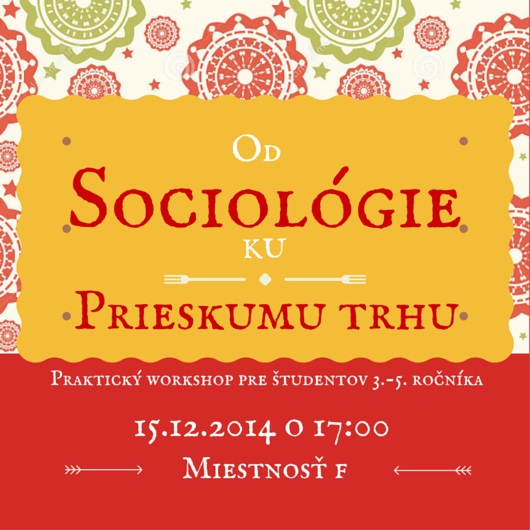 • Sekcia sociológie organizácie SSS pri SAV a Katedra sociológie VŠZaSP sv. Alžbety Vás pozývajú na workshop zameraný na zdieľanie praktických poznatkov z prieskumu trhu. Workshop sa uskutoční v pondelok 15.12. o 17:00 v Bratislave na Poliankach. Pozvánka na stiahnutie tu.